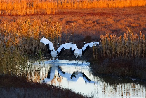 在黑龙江扎龙自然保护区内,一群傲骨嶙嶙的丹顶鹤栖息于此,或极目远眺,或花前月下,或闲庭若步,或展翅飞翔,中国国鸟,不负盛名。