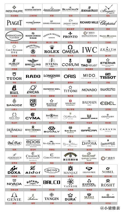 还有理查德米勒RICHARD MILLE、萧邦Chopard、帕玛强尼Parmigiani、罗杰杜彼Roger Dubuis、弗兰克·穆勒Franck Muller、百浪多PRONTO、名士Baume & Mercier、艾美表MAURICE LACROIX、艾美达Armand Nicolet、宝齐莱Carl F.Bucherer、劳力士Rolex、欧米茄OMEGA、万国表IWC、真力时ZENITH、宇舶表HUBLOT、百年灵Breitling、尊皇表Juvenia、昆仑表Corum、泰格豪雅TAG Heuer、绮年华ETERNA、帝舵Tudor、雷达表Rado、浪琴Longines、豪利时Oris、美度Mido、天梭Tissot、依波路Ernest Borel、英纳格ENICAR、蕾蒙威Raymond Weil、梅花表Titoni、摩凡陀Movado、斯沃琪SWATCH、山度士SANTOZ、康斯登Frederique Constant、五星上将BLANSACAR、瑞士军表SWISSARMY、宝曼表Balmain、玉宝表EBEL、铁达时表Solvil et Titus、西马表CYMA、柏莱士Bell & Ross、亨利慕时H. Moser & Cie、宇宙表Universal、世纪表Century、帝后表Delaneau、梭曼表Revue Thommen、宝华利BOVALY、艾米龙Emile Chouriet、世家表Sarcar、卡纷表CARVEN、柏高Paul Picot、爱宝时Epos、梵德宝Bauwede、库尔沃Cuervo y Sobrinos、迪沃斯Davosa、依百克表EBERHARDCo、爱罗表AEROWATCH、查梅斯CHARMEX 、瑞宝Chronoswiss、瓦斯针Westend、高珀富斯表Greubel Forsey、君皇CONCORD。