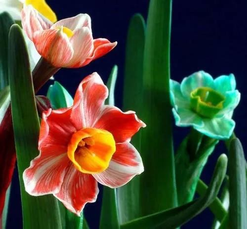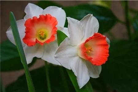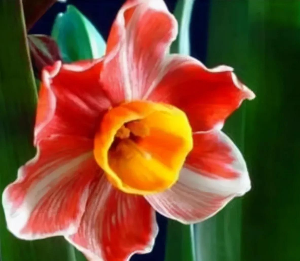 红口水仙又名红水仙,它的花朵一般为单生,花瓣为红、白、绿三色,副冠呈浅杯状的黄色或者白色,红口水仙为草本植物的球根花卉,鳞茎卵圆形;叶片鳞茎抽出,线形或披针形。花单生,花被纯白,副冠橙黄,边缘有波齿。早春盛花,花色艳丽,适水养、土培盆栽观赏或庭院布置。