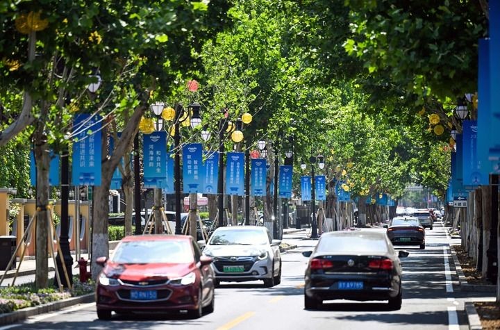 在天津市和平区泰安道,道路两旁的路灯上悬挂着2025夏季达沃斯论坛宣传标语(6月21日摄)。