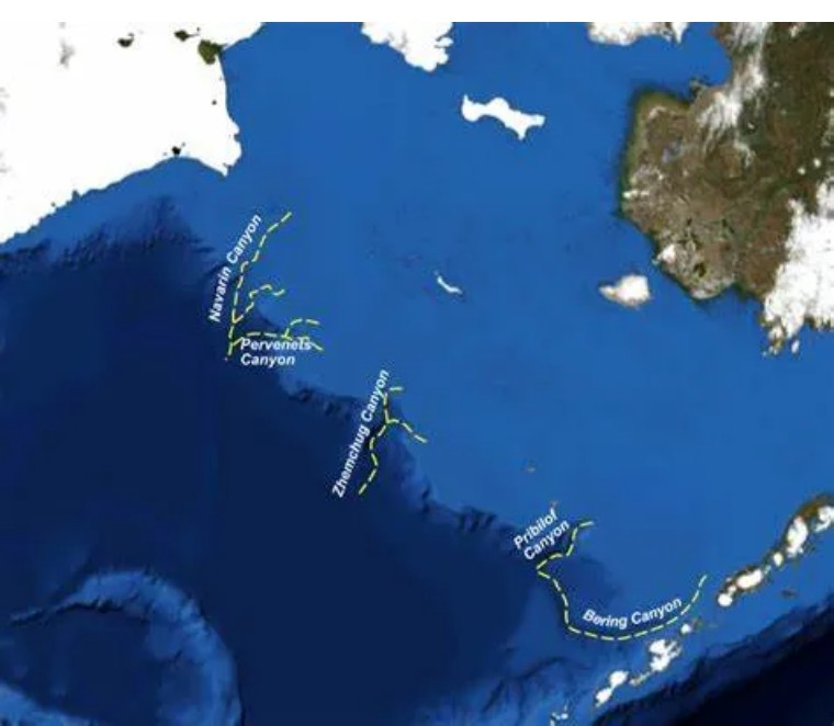 白令海是世界上大峡谷的聚集地:水下有3个又深又长的深海峡谷——白令峡谷、普瑞比洛夫峡谷和哲姆丘格峡谷,切开了白令海东南方向的大陆坡。其中,白令峡谷是世界最长的大陆坡峡谷,它有近400千米长,容积大约有4300立方千米。普瑞比洛夫峡谷的容积有1300立方千米,而哲姆丘格峡谷有8500立方千米。哲姆丘格峡谷是世界上最大的大陆坡峡谷,大部其他峡谷的容积一般只有500立方千米。