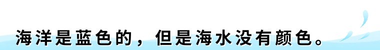 海洋是蓝色的,因为海水把蓝色以外的光谱部分都吸收掉了。就像过滤器一样,其他颜色的光被吸收,只让蓝色通过,看起来就是蓝色。海洋有时候也会呈现其他的颜色,比如绿色或红色,这是因为光线被水中悬浮的颗粒或物体反射回了海面。然而,大部分的海洋是完全黑暗的,因为阳光很难穿过657英尺(328米)的深度,而任何光线都不可能穿过3280英尺的深度。