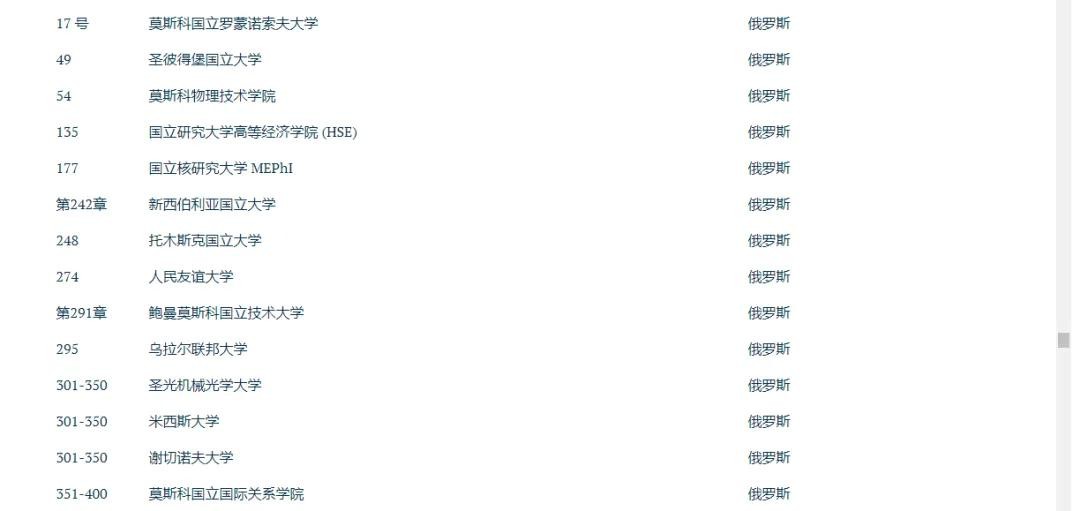 莫斯科国立大学排名第17,这是俄罗斯大学中最好的成绩;其次是圣彼得堡国立大学(第49名)和莫斯科物理技术学院(第54名)。俄罗斯有152所大学进入“三大大学使命”排名,比去年减少了两所大学。