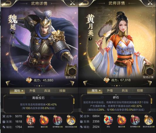由于投石车最佳副将庞统会搭配刘邦,黄月英投石车二队可以选择搭配姜维,效果比前期为了省碎片拿来过渡的魏延、诸葛亮要好。