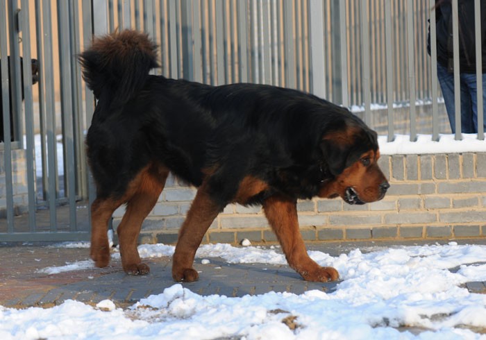 大腿发育良好,肌肉发达,从后面看,两腿在飞节处有轻微的拱形。后膝关节有平衡作用,坚强有弹性。飞节强韧,飞节以下两腿平行。运动中的藏獒呈现出自由有力的步态。运动是犬在耐力和敏捷下越过变化的地形的能力,这种有弹性而灵活的步态证实了犬后腿和前腿能够很好的扩展及从走到小跑的运动过程,藏獒留下了单一的踪迹。该品种犬在任何运动中都能确保身体的平衡和体形。