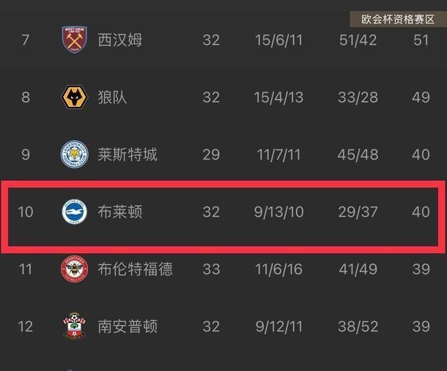 布莱顿目前排在联赛第10名,取得了9胜13平10负,进29球失37球的成绩。布莱顿本赛季非常高效,进球数排在全英超第18位,仅比降级区的伯恩利和诺维奇高。但是29个进球就取得了40个积分,联赛排名在紧随莱斯特城。40分也基本上可以在英超联赛保级成功了,总体来说布莱顿本赛季表现出色。
