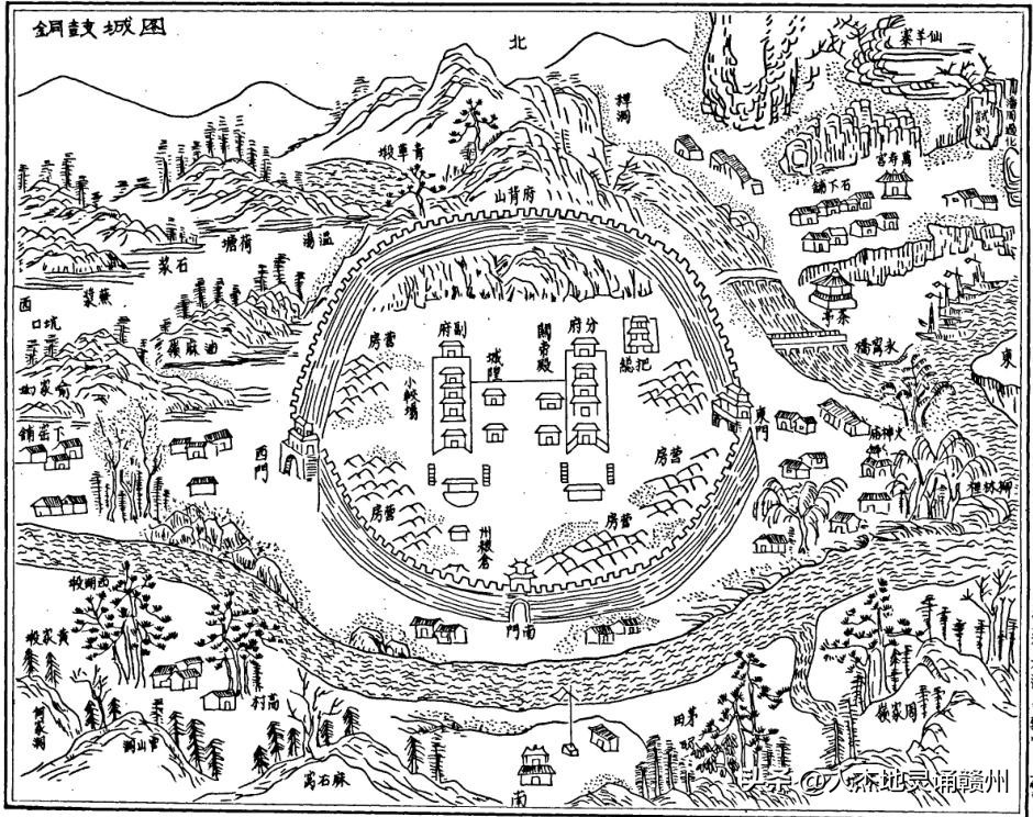 明万历年间,军制铜鼓营,为营驻地。清宣统元年(1909年)改营为厅后,遂于定江北岸,府背山前0.5平方公里平坦处筑城,并设东、南、西三门,此后镇内商业、手工业才逐渐兴旺起来。