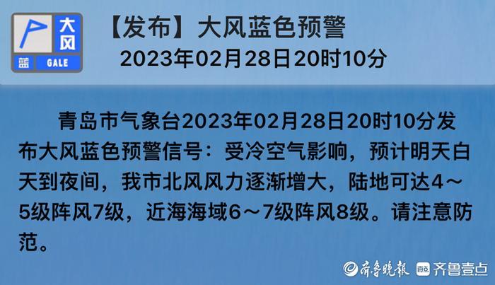 另外,近期南北风转换频繁,且风力较大。2月28日晚,青岛市气象台发布大风蓝色预警信号:受冷空气影响,预计3月1日白天到夜间,青岛市北风风力逐渐增大,陆地可达4到5级阵风7级,近海海域6到7级阵风8级。此外,3月3日,青岛的南风较大,陆地4到5级阵风6到7级,近海6到7阵风8级。