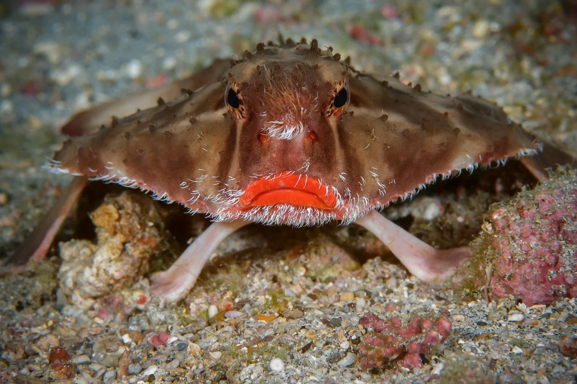 在这组图片中,有恍若外星生物的透明章鱼,颜色粉嫩的海蛞蝓,密密麻麻的笛鲷大军,在蓝色海水中悠然遨游的海龟,其中,还有一条浑身是毛的条纹躄鱼一脸挑衅的望向镜头,一片片锋利的牙齿外露,甚是吓人。