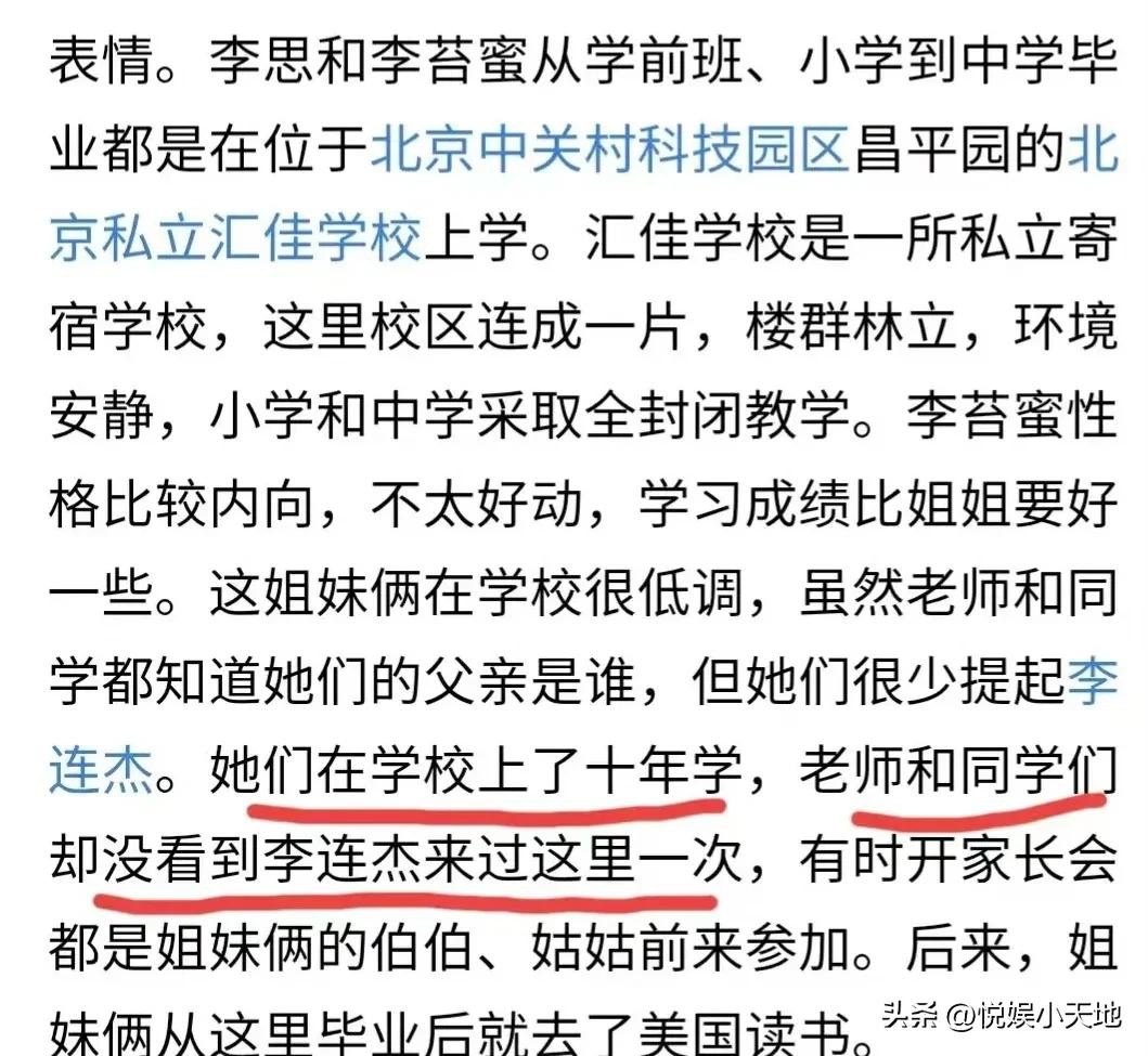 据了解,李连杰和黄秋燕离婚后,就把两个女儿李思和李苔蜜丢给奶奶照顾。学校的老师们很多都不知道这两姐妹的父亲就是李连杰,因为李连杰从来没有去过学校开家长会,也从来没有看望过她们。
