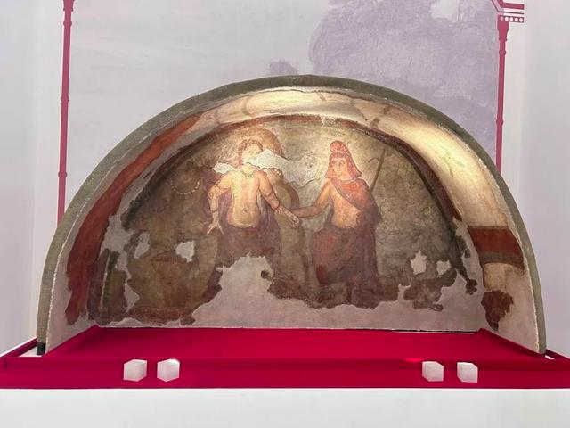 " 描绘珀耳修斯和安德罗墨达的彩绘石膏壁画 "(真品)(6 月 13 日摄)。新华社记者 张玉洁 摄