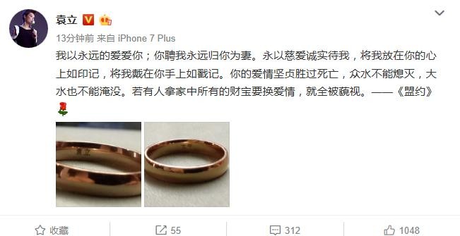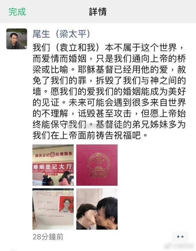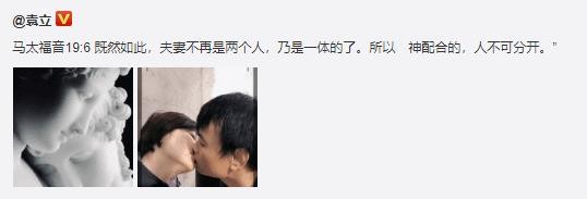 26日上午,袁立发文并晒出亲吻照证实婚讯,并写道“夫妻不再是两个人,乃是一体的了。”