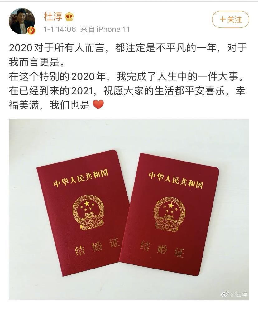 今天下午两点,杜淳在社交平台上公布了自己结婚的喜讯,并晒出结婚证,在配文中他甜蜜地表示自己“完成了人生中的一件大事”,但并未公开关于新娘的其他信息,引起网友热议。随后很快就有网友扒出去年6月,杜淳被媒体拍到和一女子成对出现在电影院,并被爆料对方是素人花店老板,两人已恋爱长跑六年。针对网络上的猜测,杜淳目前没有做出回应。
