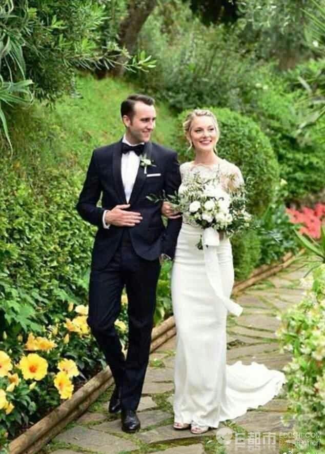 照片中27岁的马修路易斯一身西服目不转睛的看着挽着自己手的爱妻,新娘则是一身白婚纱,手捧一大束白色花束笑的十分灿烂。