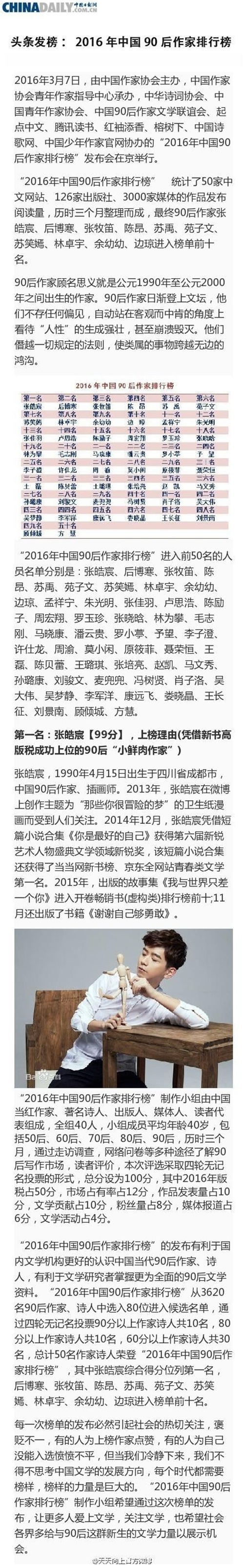 《天天向上》今晚有一位盆友是第二次"上天"哦,他就是90后颜值最高的男作家张皓宸。在22日公布的中国作家富豪榜中,皓宸是前20名中唯一的一位90后,在近期作协公布的90后作家排行榜中以99分的高分拿下第一皓宸简直是在用生命诠释"明明可以靠脸吃饭却偏偏要靠才华"BTW,这些都不算什么!最重要的是,你们的老公——BIGBANG的TOP哥居然也在看他的书!
