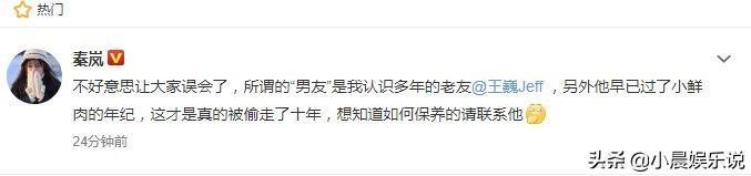 不少网友以为秦岚好事将近,各大媒体争相报导,随后秦岚本人作出回应:原来媒体中所谓的“男友”是秦岚多年的老友王巍。而秦岚打趣到王巍早已过了“小鲜肉”年纪了。需要保养秘诀请联系他哦,看来不是相当好的朋友也不会这么调侃了。