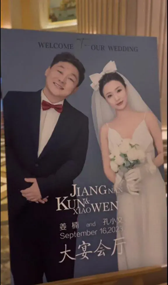 新娘夫妇站在婚礼迎宾板前,他们的颜值相差悬殊。尽管通过PS加工过,但仍然能够明显看出新娘的容颜比江南老了至少一倍。
