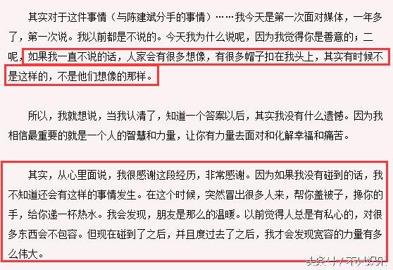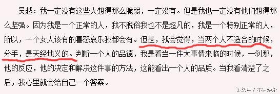 2006年,在陈建斌跟蒋勤勤在金鹰节上大秀恩爱之后,吴越才首次发声,没有抱怨,也没有责怪谁,聊天记载的文字里你可以看出她已经完全放下并且过的自由自在,毕竟是曾经深爱的人,她表现得无怨无悔。