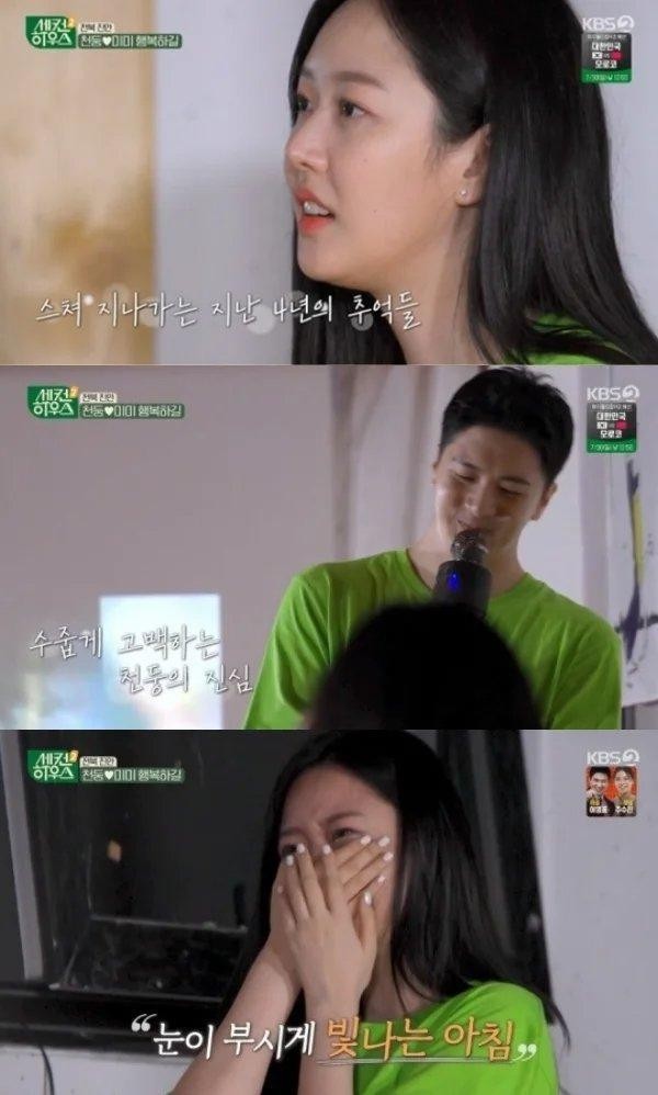 天动于 2009 年在 MBLAQ 首次亮相,是2NE1 Sandara Park朴山多拉的亲弟弟,目前作为说唱歌手活跃,Mimi于2016年以gugudan成员身份出道,目前担任演员。对于,韩国明星情侣天动和Mimi,在节目中公开求婚,她感动到落泪,最后拥抱和亲吻,大家怎么看呢?