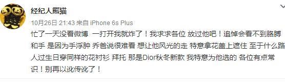 忙了一天没看微博 一打开我就炸了!我求求各位 放过他吧!追悼会看不到胳膊和手 是因为手浮肿 乔爸说很难看 想让他风光的走 特意拿花盖上遮住 至于什么路人过生日穿同样的花衬衫 拜托 那是Dior秋冬新款 我特意为他选的 各位有点常识!别再以讹传讹了!
