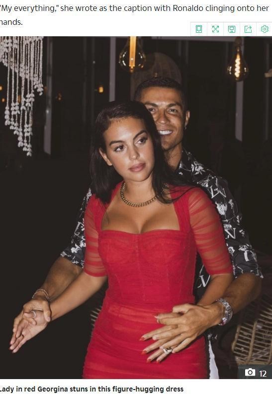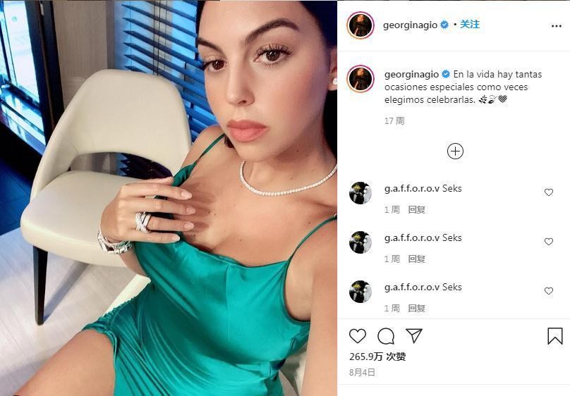 排在第 9 位的是乔治娜与 C 罗的一张恩爱照。照片中,乔治娜身穿一袭红色连衣裙,娇艳动人,而 C 罗则在身后露出了幸福的微笑。在这张照片中,乔治娜还动情地写道:“(你就是)我的一切。” 如今,这张照片收获了 347 万的点赞。