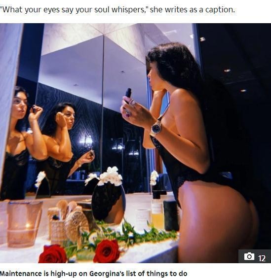 能 “俘获” C 罗的心,乔治娜自然有其过人之处,其中一点便是她精致的容颜。在以上这张照片中,乔治娜正在修饰自己的眼线,并且秀出了自己傲人的身材。在这张照片旁,她评论道:“你的眼睛诉说着你的灵魂。” 粉丝们为这张照片送上了 367 万的点赞。
