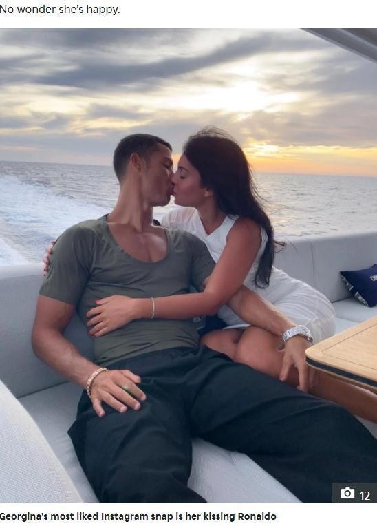 乔治娜经常在她的个人社交媒体上晒出她与 C 罗恩爱的照片,而排名第一位的便是她与葡萄牙人的一张吻照。在图片旁,她还深情地写道:“我有多么幸运”。对于这张爱意满满的合影,有近四分之一的粉丝给予了点赞,点赞量达到了惊人的 496 万!