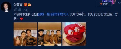 2月8日,张智霖、袁咏仪同时在个人社交账号中上传了二人的合照,并配文称:“21周年快乐!谢谢!”