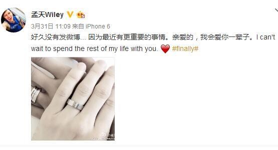 今年3月31日,吴孟天微博晒出两只戴着戒指的手的图片,并写下:“好久没有发微博… 因为最近有更重要的事情。亲爱的,我会爱你一辈子。I can't wait to spend the rest of my life with you.”