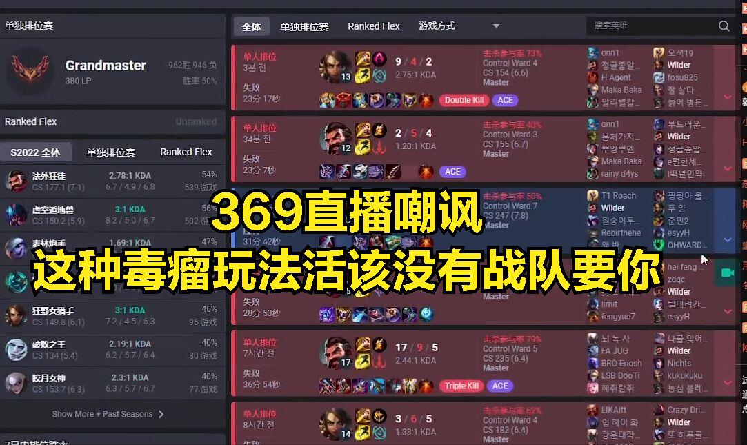 在369被这个打野搞破防输掉排位之后,369也是在OPGG网站上面查询这个打野的战绩,发现这个打野曾经是LCK联赛的职业选手,在LCK联盟没有人要所以最终去了日本赛区打职业,而在日本赛区打了一年之后,就因为表现太差没有任何战队,目前处于半退役状态,而369在看到,这个打野是一个没有人要的选手之后,369也是直播嘲讽:就这种没有团队意识的打野和排位恶心队友的玩法,活该没有人要,这种打野谁要谁倒霉。