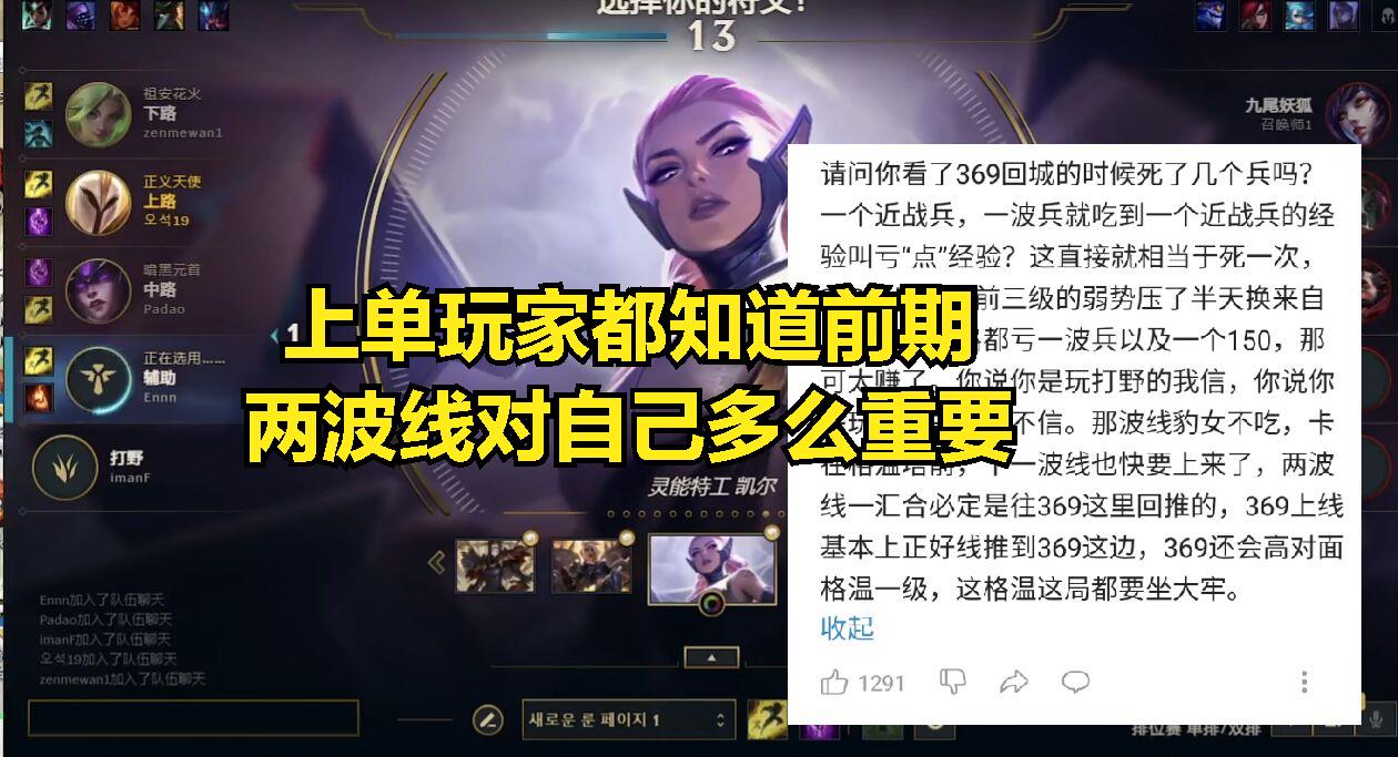 在前几年369的风评也是不断下滑,更是被TES教练战马吐槽为团队短板,不过随着369的转会到JDG,369这个选手的上限也是被玩家们发现,观看过JDG战队比赛的观众应该清楚,如今369最拿手的两个英雄就是船长和塞恩,不过其他英雄369也是在排位当中经常练习,比如说版本热门的上单天使也是369不断排位训练的目标,不过最近369在直播当中使用天使却被LCK前职业选手搞破防。
