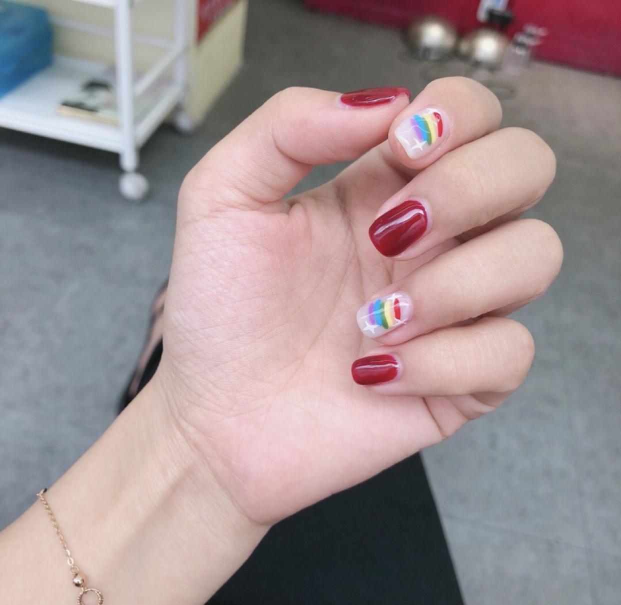 首先是这种元气满满的彩虹美甲,这也是当下非常流行的泫雅风美甲,用活泼的色彩在甲面上打造出彩虹的造型,搭配上纯色美甲,会让指尖更多了一些元气满满的少女风,真的很棒哦!