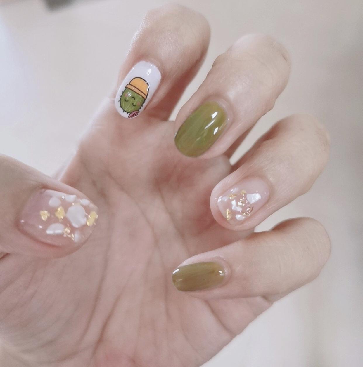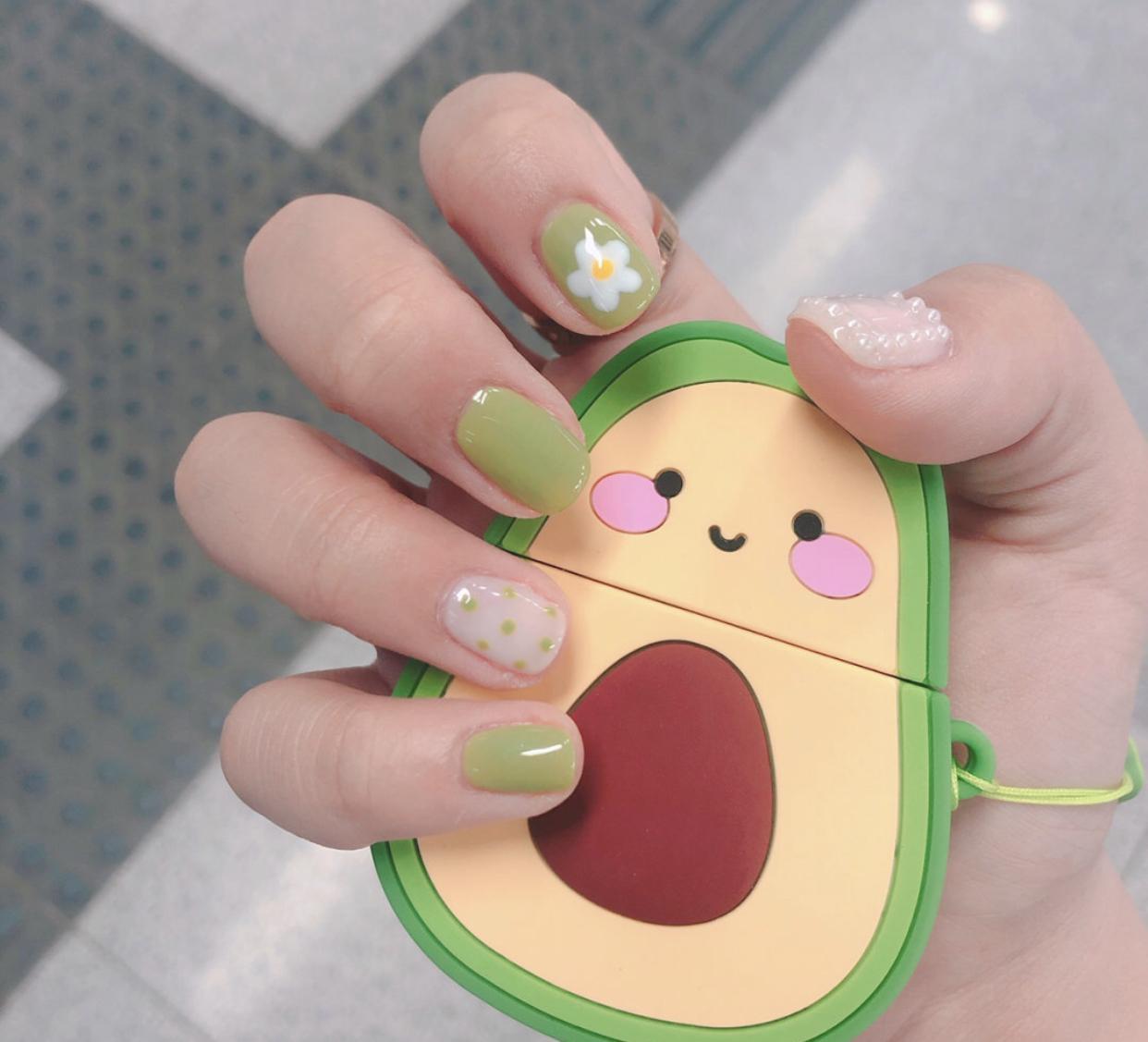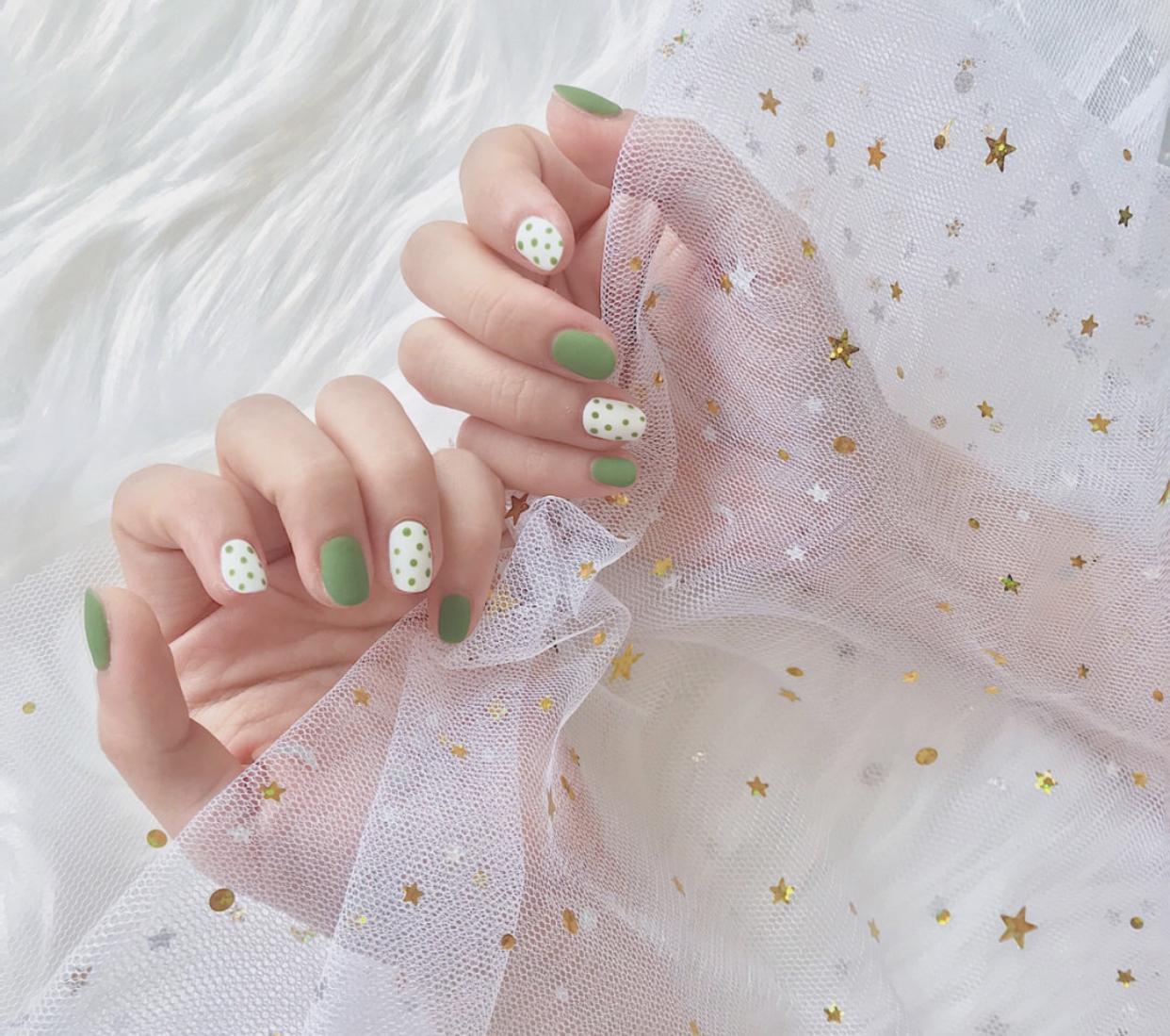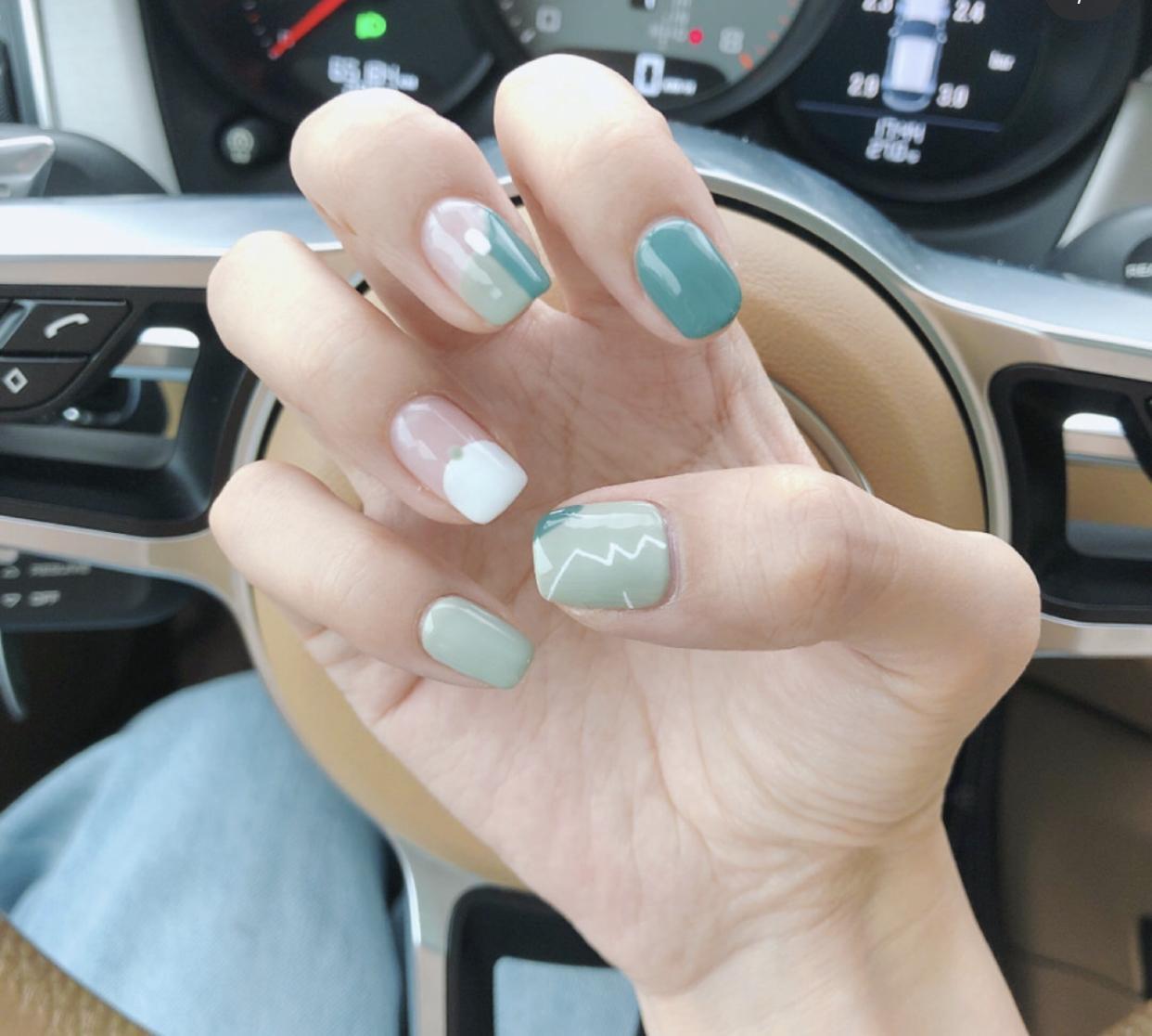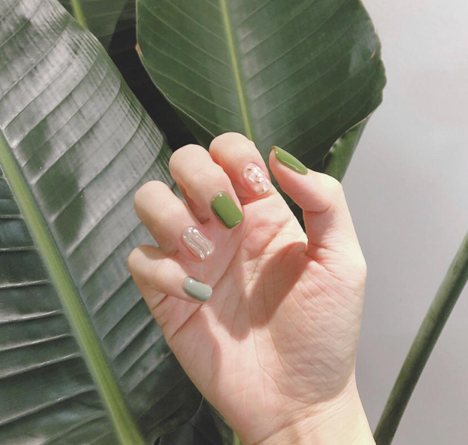 而且其实绿色美甲也是超级适合短甲的一个颜色,像这样的网红爆款美甲,做在短甲上显得非常干净清爽,可爱中又带着强大的时髦气质,非常讨喜啦!