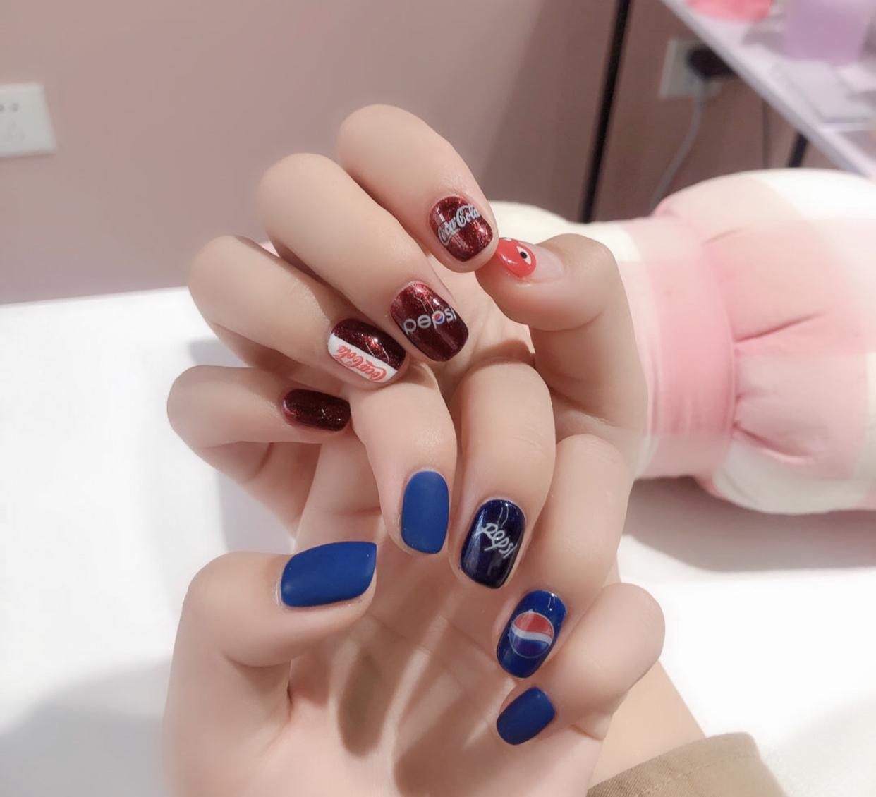 短甲做上彩绘美甲,会比长指甲显得更加活泼一些,因为圆润的甲型,首先就有着比较饱满的视觉效果,所以加上一些图案,会显得更有亲和力哦!