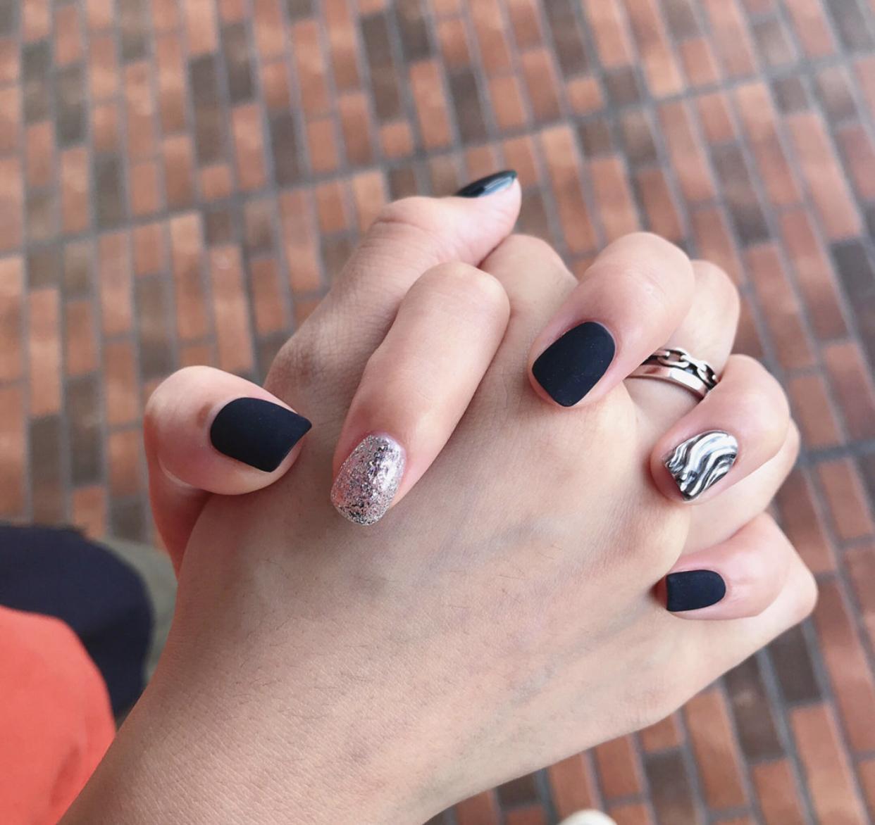 夏天其实很多女生都很喜欢酷酷的黑色美甲,黑色其实也是超具时髦气质的一个颜色,做成简约的纯色美甲,气场超级强大哦,如果担心指尖显得过于严肃,我们也可以搭配上一些亮片美甲和镜面美甲,看起来会更亮眼哦!