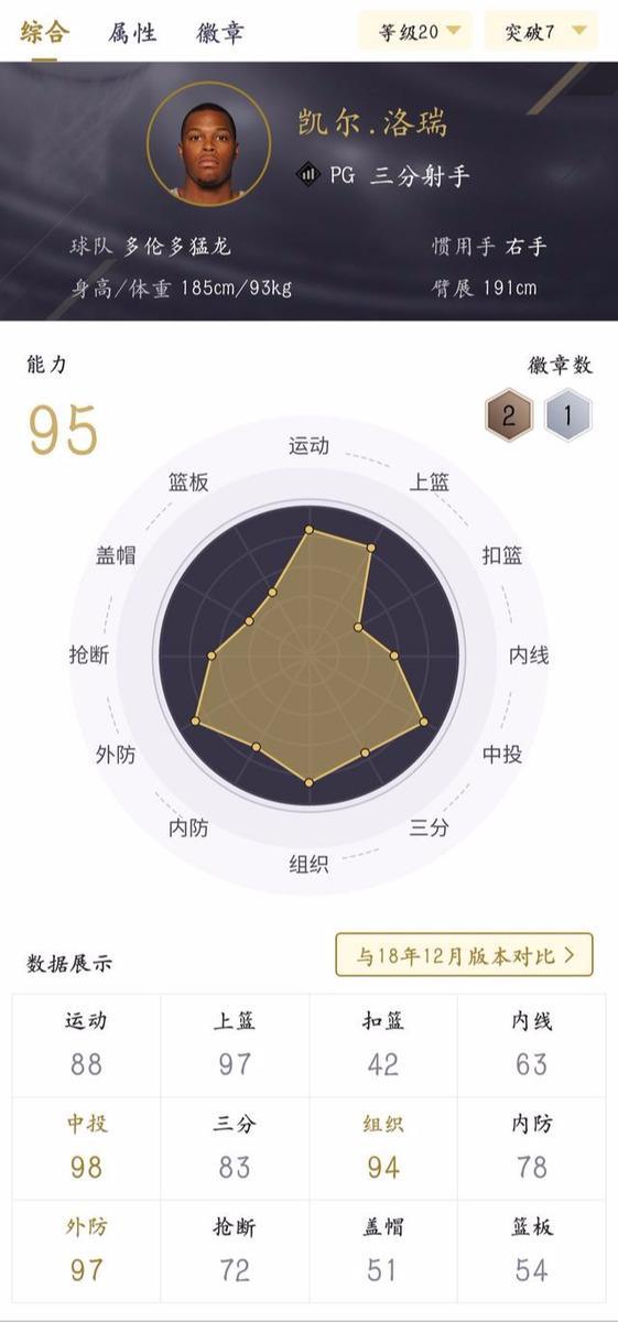能力值为95。持有徽章:进攻犯规制造者、挡拆战术大师、空接传球者。他的运动能力出众,外线防守达到了97分,在如今小球时代,有许多的控卫会得到越来越多的外线出手机会,比如斯蒂芬库里、利拉德等有着顶级的外线投射能力。凯里洛瑞在比赛中会很大程度上限制对方控球后卫出手的命中率。同时,他的中投和三分数值也比较令人满意,组织能力不俗,能更好地作为球队大脑,串联球队的进攻端。出手手感比较柔和,掌握后很容易绿条进球,是本期最合适不过的对位球员。