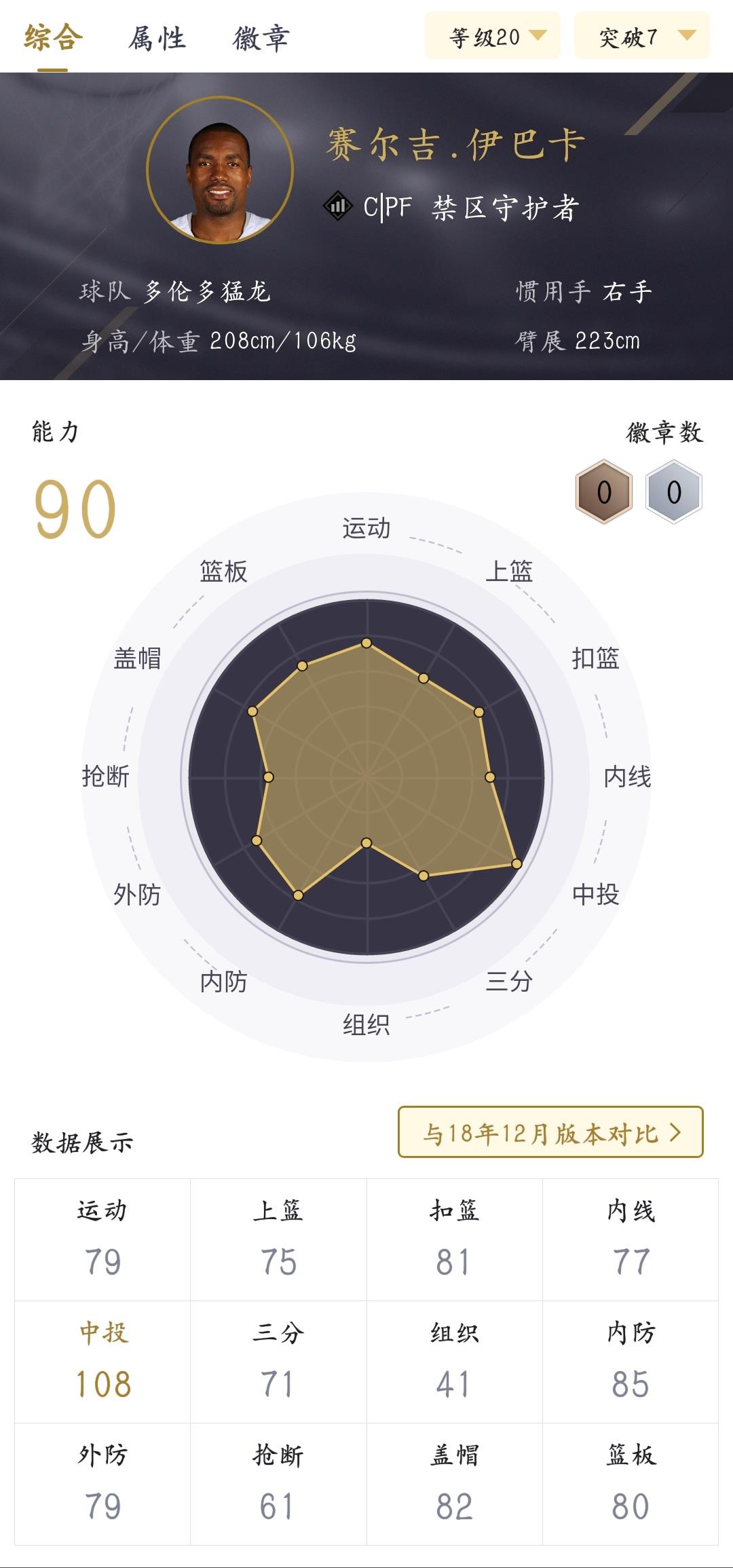 能力值为90。他在联盟中的防守能力有目共睹。要不是当初在雷霆打了封闭针,现在他的打法或许会更加的暴力。图片上显示:中投已经到了顶端,108分。单卡200万的凯文-杜兰特也不过113分。伊巴卡的各项数据很全面,这也让他在这套阵容体系中能更大发挥出他的作用,作为两个赛季的盖帽王,他的内线防守能力不必多说,上图!