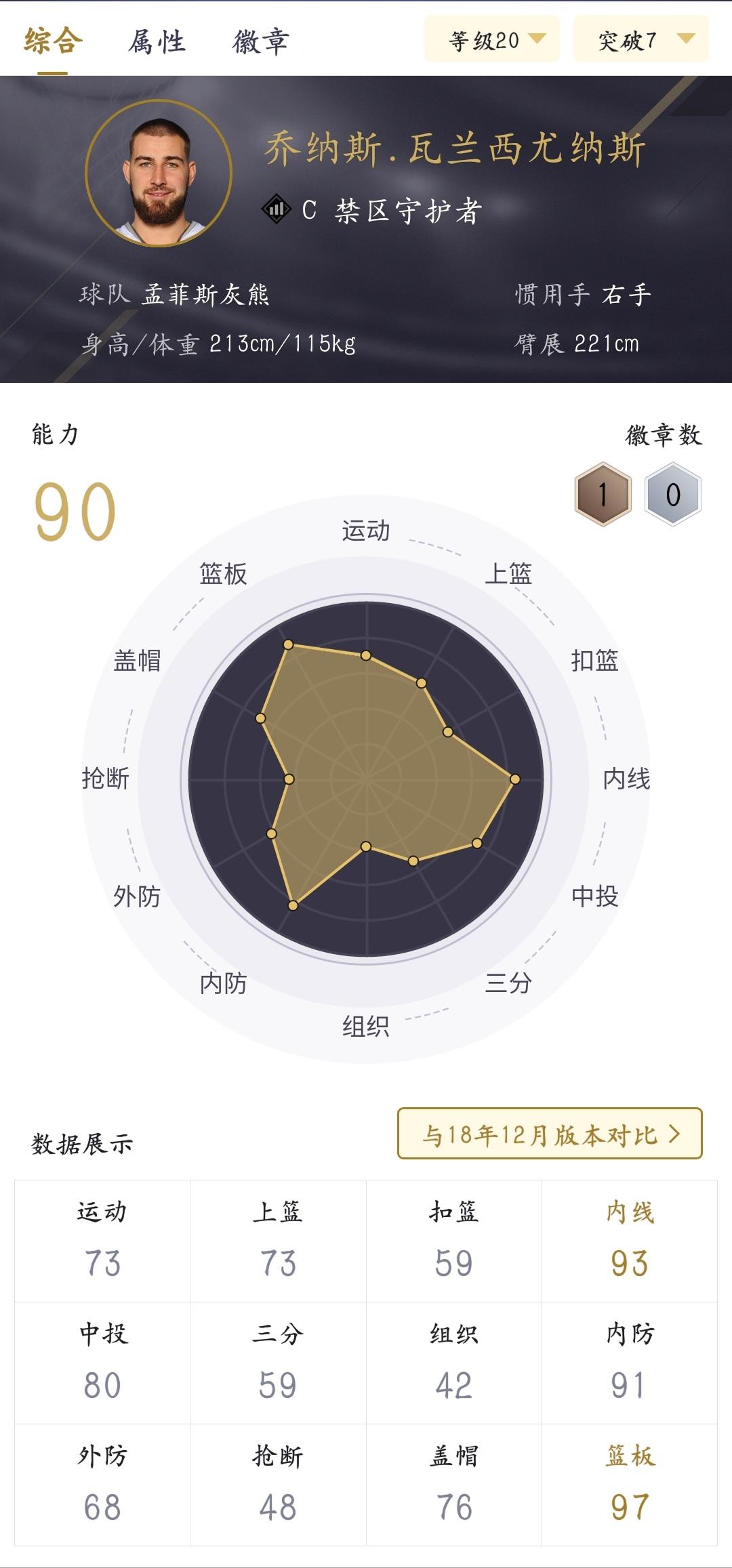 能力值为90。持有徽章:好斗者。他的数据似乎没有多么的出众,但小编的上手感觉很有侵略性,手感好。首先他的篮板能力为97,盖帽能力虽然一般,但也算是合格,关键是他有着稳定的中投,他的运动能力在所有中锋中比较优秀,完美适合本套阵容体系。在实战中,他会承担起内线大闸的责任,护框能力一流,抢到后场篮板后能迅速转换进攻。当然,在进攻打不开局面的情况下,用他低位靠打,小编告诉你,很稳。