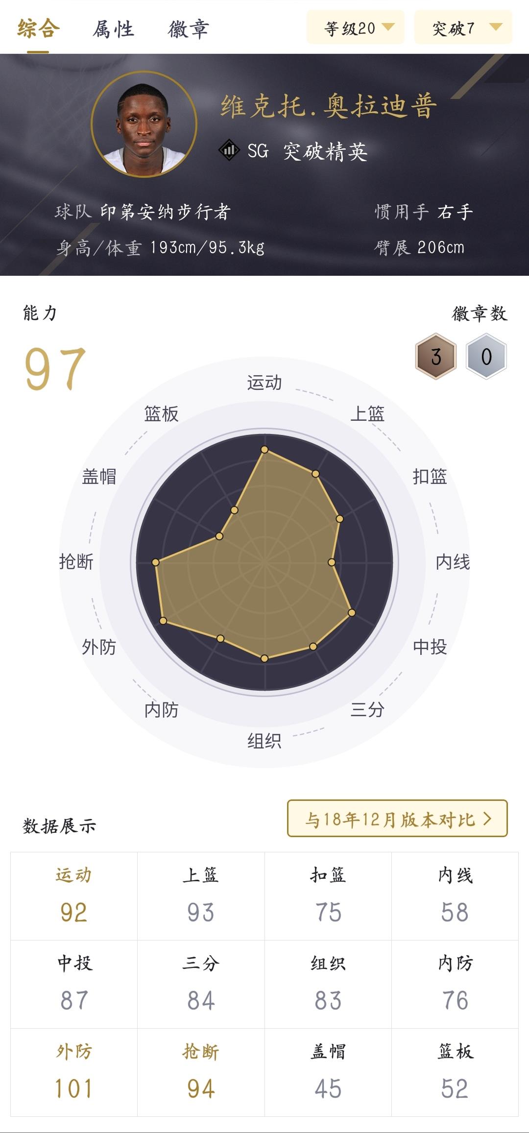 能力值为97。持有徽章:接球投篮手、挡拆躲闪者、追帽大师。奥迪在出走雷霆后在联盟中打得风生水起,不仅仅是因为他有着不俗的领导能力,更因为他的技术全面。NBA2KOL2中将他定义为突破精英,此外他的运动能力顶级,还有着85+的中投和三分球,这让他在本期阵容中如鱼得水,可以在球队没有投篮空间时利用自己的突破能力造成杀伤、吸引包夹帮助队友找到投篮位置。最令人惊叹的是他的防守得到了101的高分,抢断94分,这使他在防守端也能轻松限制住对方的得分后卫,小编认为他可以作为本期球队的核心人物。