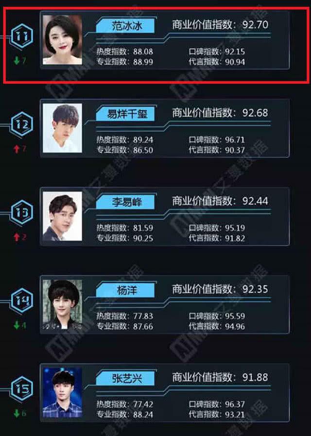 范冰冰目前商业价值大跌,本来一直是前三的她,最新的某平台数据发布的7月艺人商业价值榜,范冰冰的排名已经跌到第十一,让人非常意外。