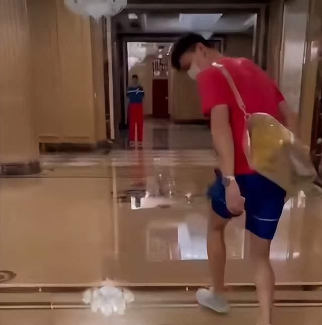 照片中,30岁的孙杨身穿白色T恤,打扮相当随意,他与工作人员边走边说事情,双手不停比划,情绪有点激动。