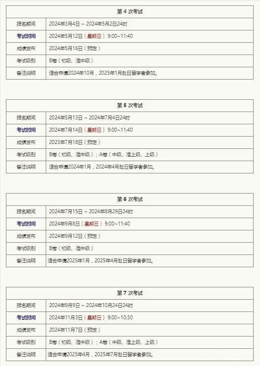 2024年日语等级考试报名和考试时间