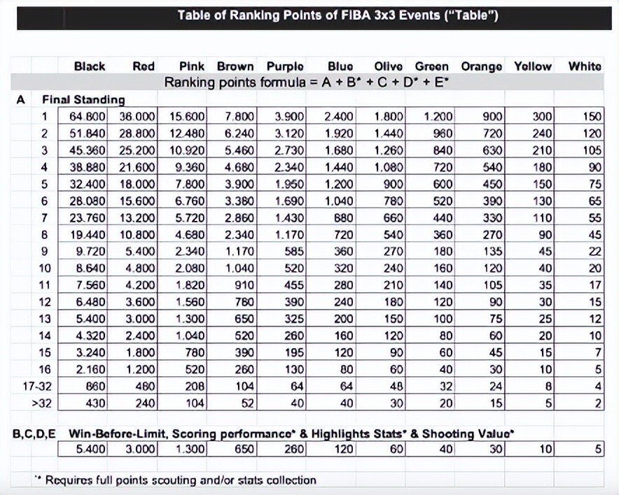 FIBA 3x3决赛排名积分的多少将取决于赛事的级别(从白色到黑色),具体情况如下: