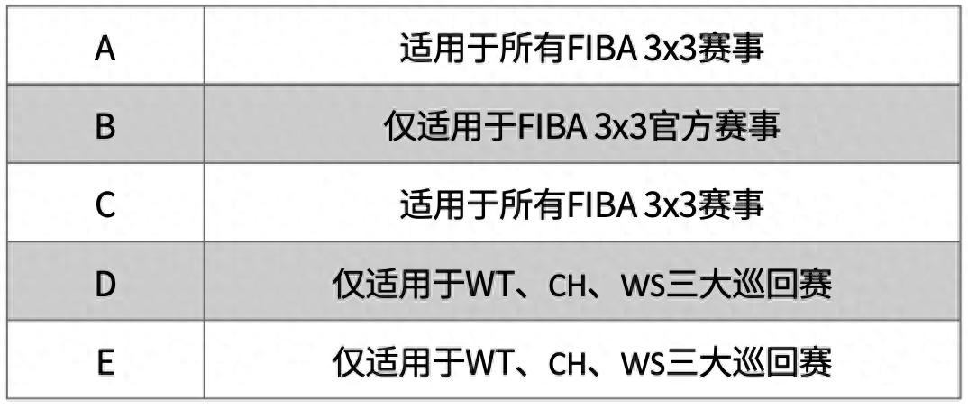 以上五项积分记录方式在FIBA 3x3赛事中的应用情况如下表:
