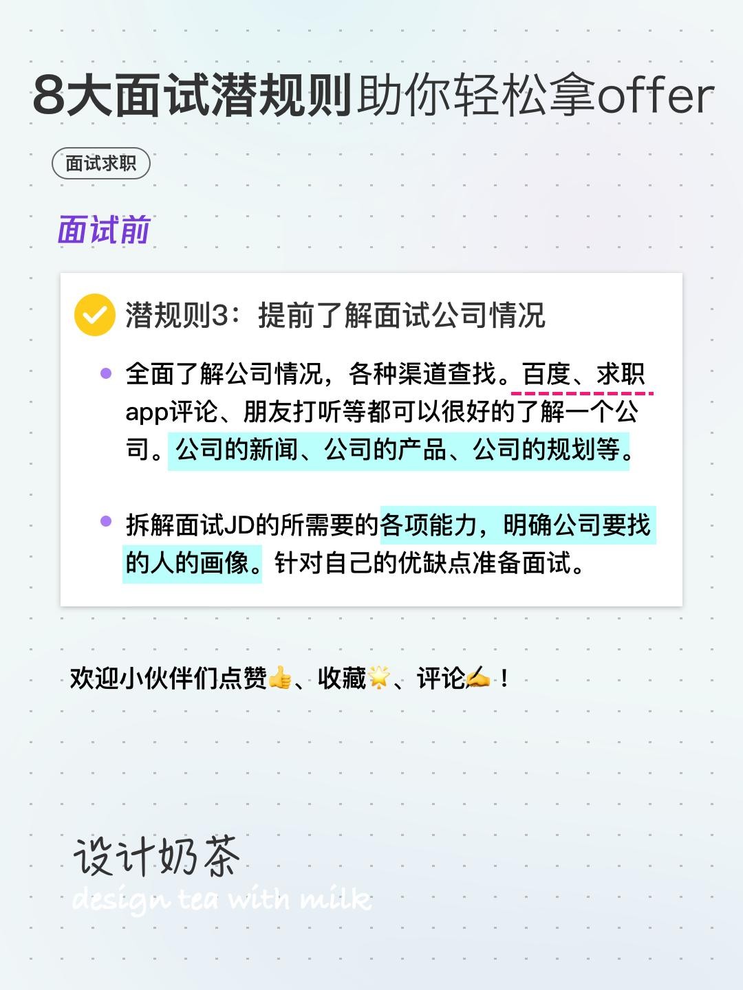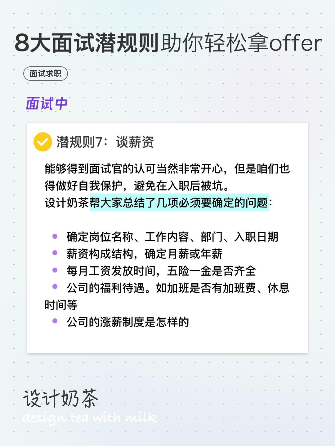 能够得到面试官的认可当然非常开心,但是咱们也得做好自我保护,避免在入职后被坑。设计奶茶帮大家总结了几项必须要确定的问题: