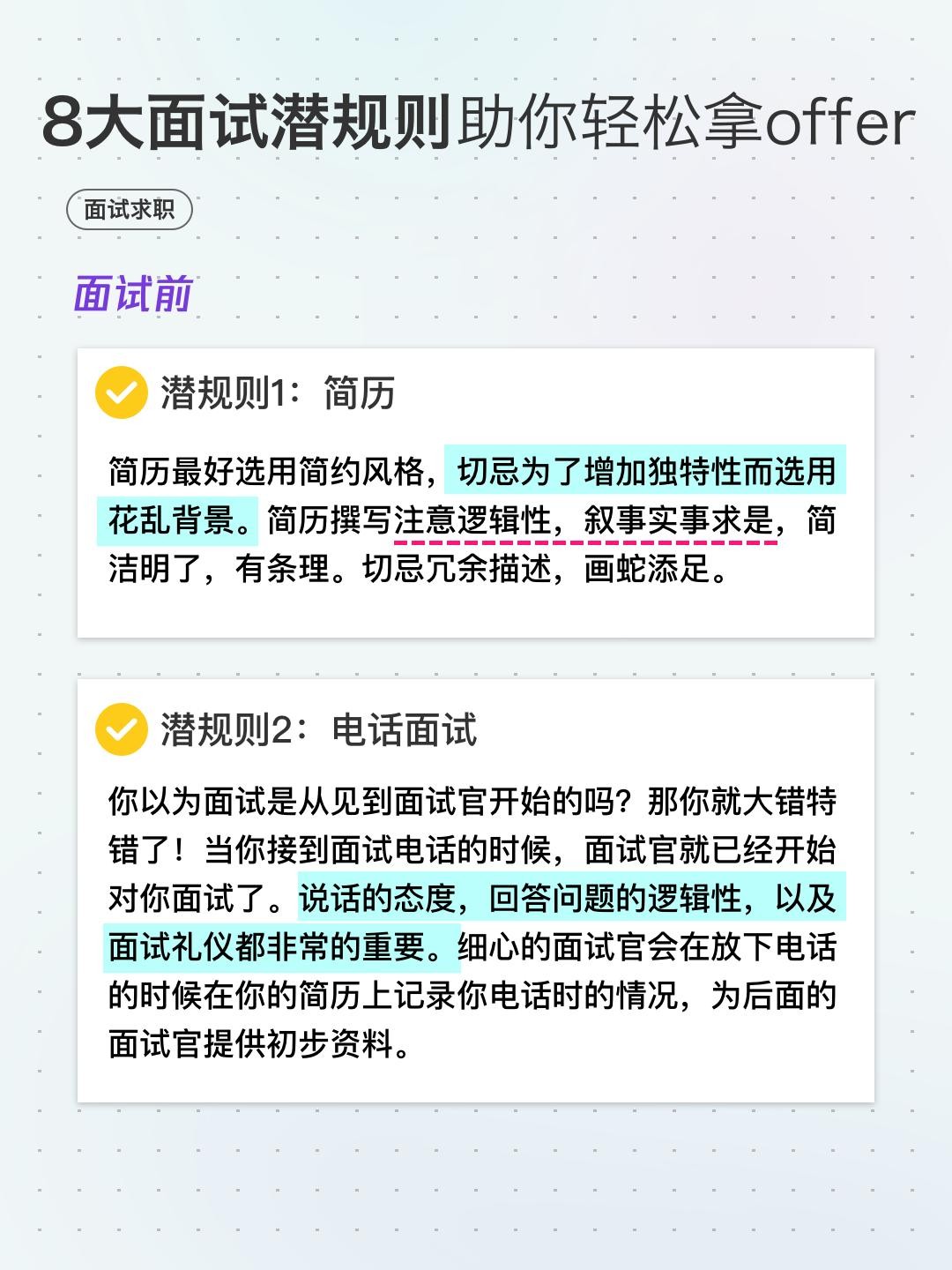 简历:选用简约风格,切忌为了增加独特性而选用花乱背景。简历撰写注意逻辑性,叙事实事求是,简洁明了,有条理。切忌冗余描述,画蛇添足。电话面试:你以为面试真的是从见到面试官开始吗?那你就大错特错了!当你接到面试电话的时候,面试官就已经开始对你面试了。说话的态度,回答问题的逻辑性,以及面试礼仪都非常的重要。细心的面试官会在放下电话的时候在你的简历上记录你电话时的情况。为后面的面试官提供初步资料。提前了解面试公司情况全面了解公司情况,各种渠道查找。百度、求职app评论、朋友打听等都可以很好的了解一个公司。公司的新闻、公司的产品、公司的规划等。拆解面试JD的所需要的各项能力,明确公司要找的人的画像。针对自己的优缺点准备面试。