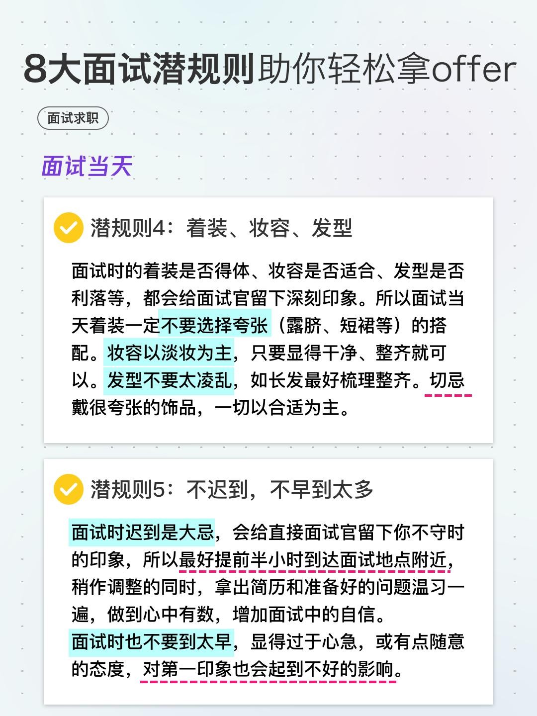 1、着装、妆容、发型:面试时的着装是否得体、妆容是否适合、发型是否利落等,都会给面试官留下深刻印象。所以面试当天着装一定不要选择夸张(露脐、短裙等)的搭配。妆容以淡妆为主,只要显得干净、整齐就可以。发型不要太凌乱,如长发最好梳理整齐。切忌戴很夸张的饰品,一切以合适为主。