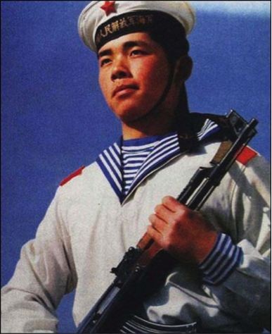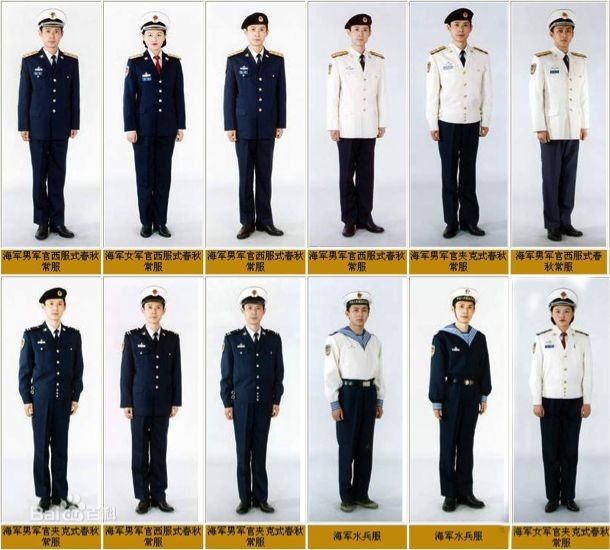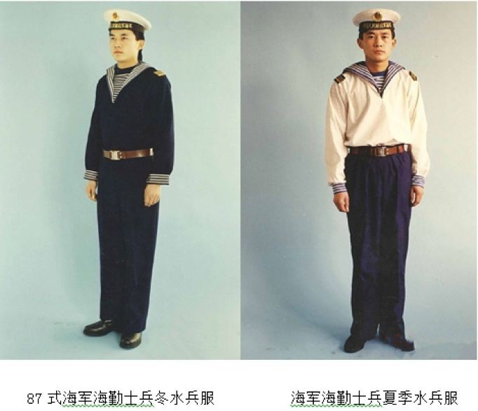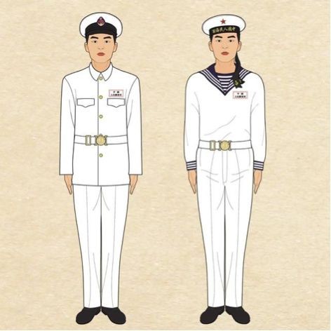 74式海军服恢复1965年以前的上白下蓝、全蓝服装,战士恢复水兵服、水兵帽,干部恢复大檐帽。