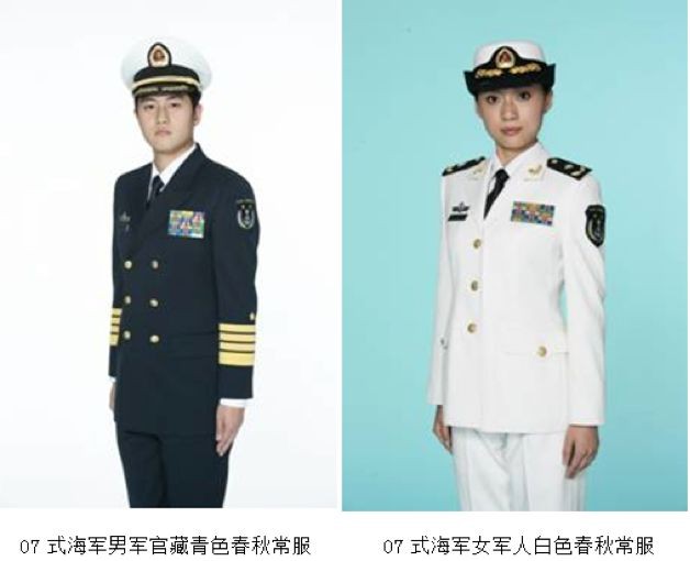 07式海军军服由原来的藏青色调整为深藏青色,本白色调整为白色,上白、下藏青色调整为全白色。“07”式军服是我军历史上最全面、最系统、最彻底的一次改革。