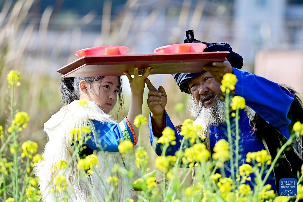 2月5日,南涧彝族跳菜省级非物质文化遗产代表性传承人阿本枝(中)在给孙辈传授跳菜技艺。新华社记者陈欣波摄
